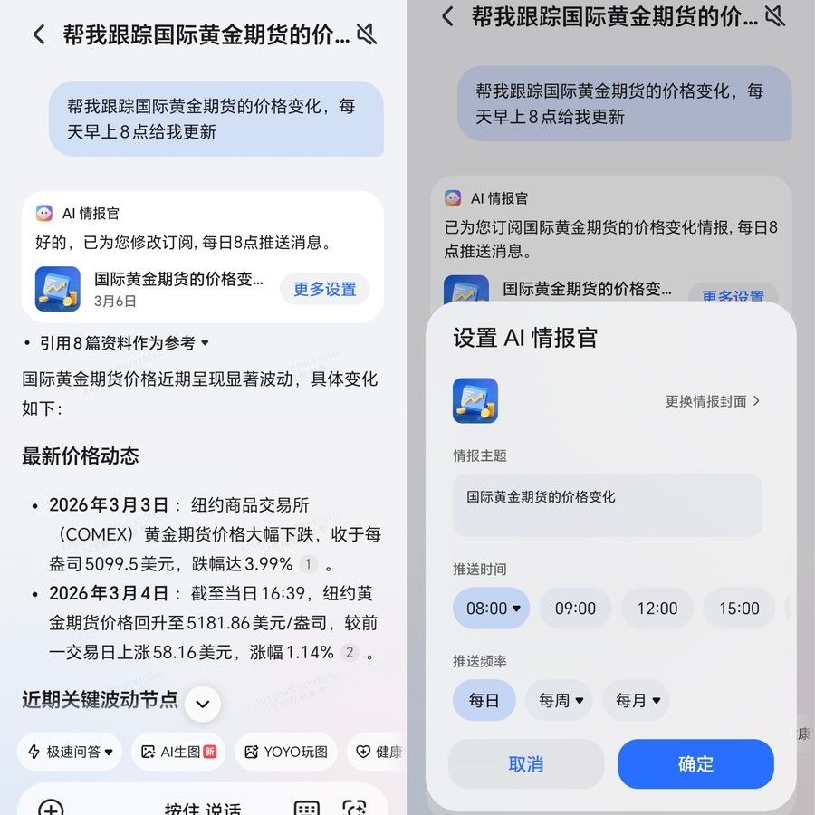 针对金融东谈主士,荣耀Magic V6还带来安卓首发的AI一屏盯双股功能,伸开大屏后可同期展示两只股票行情,同步刷新,也能一屏盯行情、一屏盯个股,无需反复跳转,让投资决策更高效。